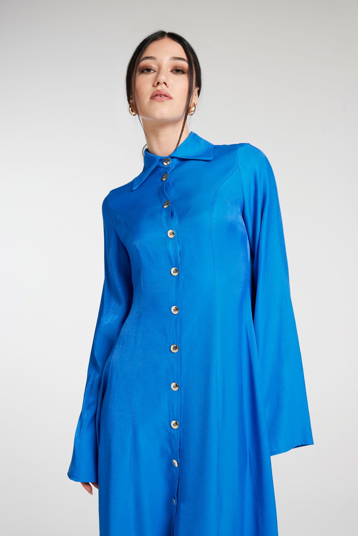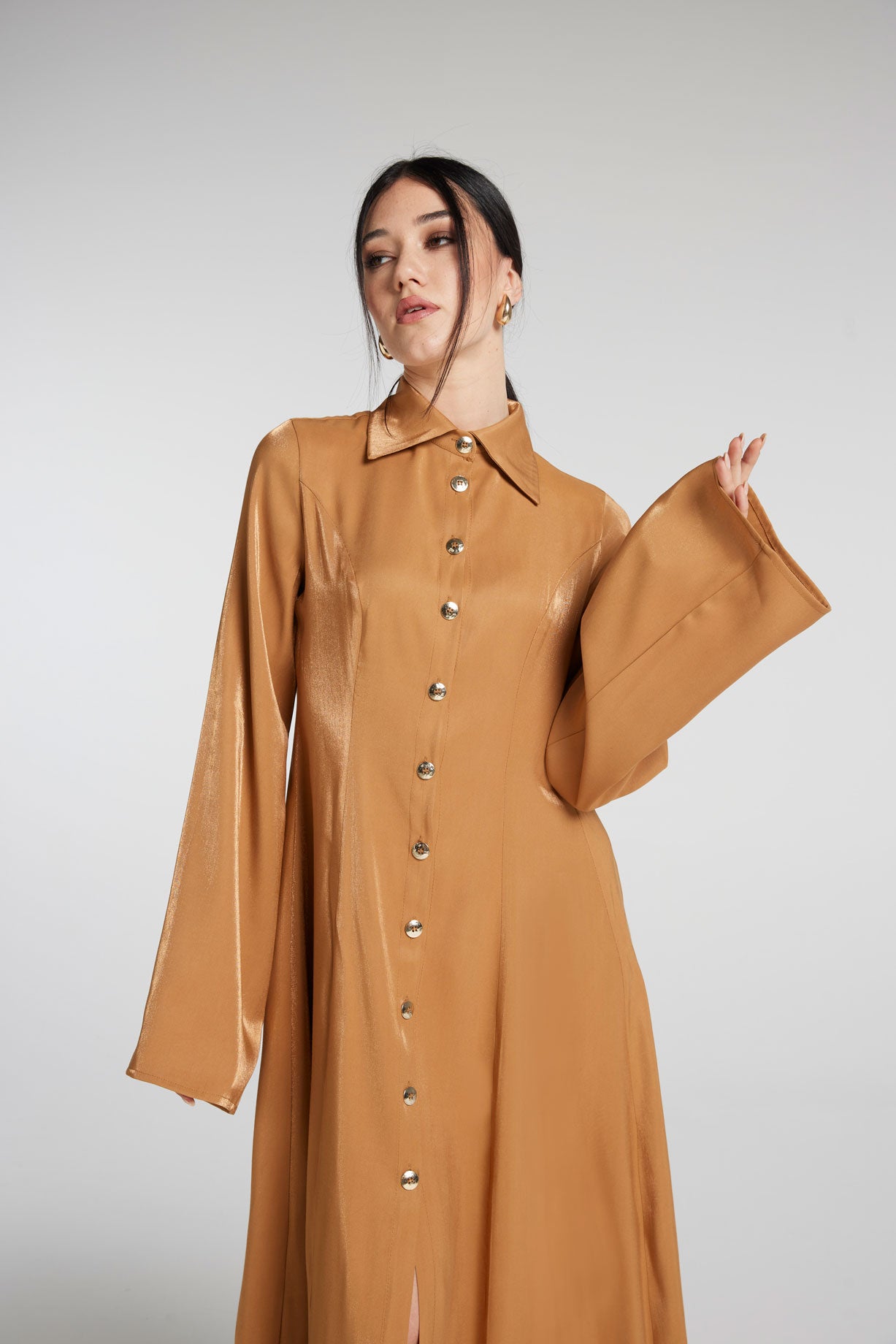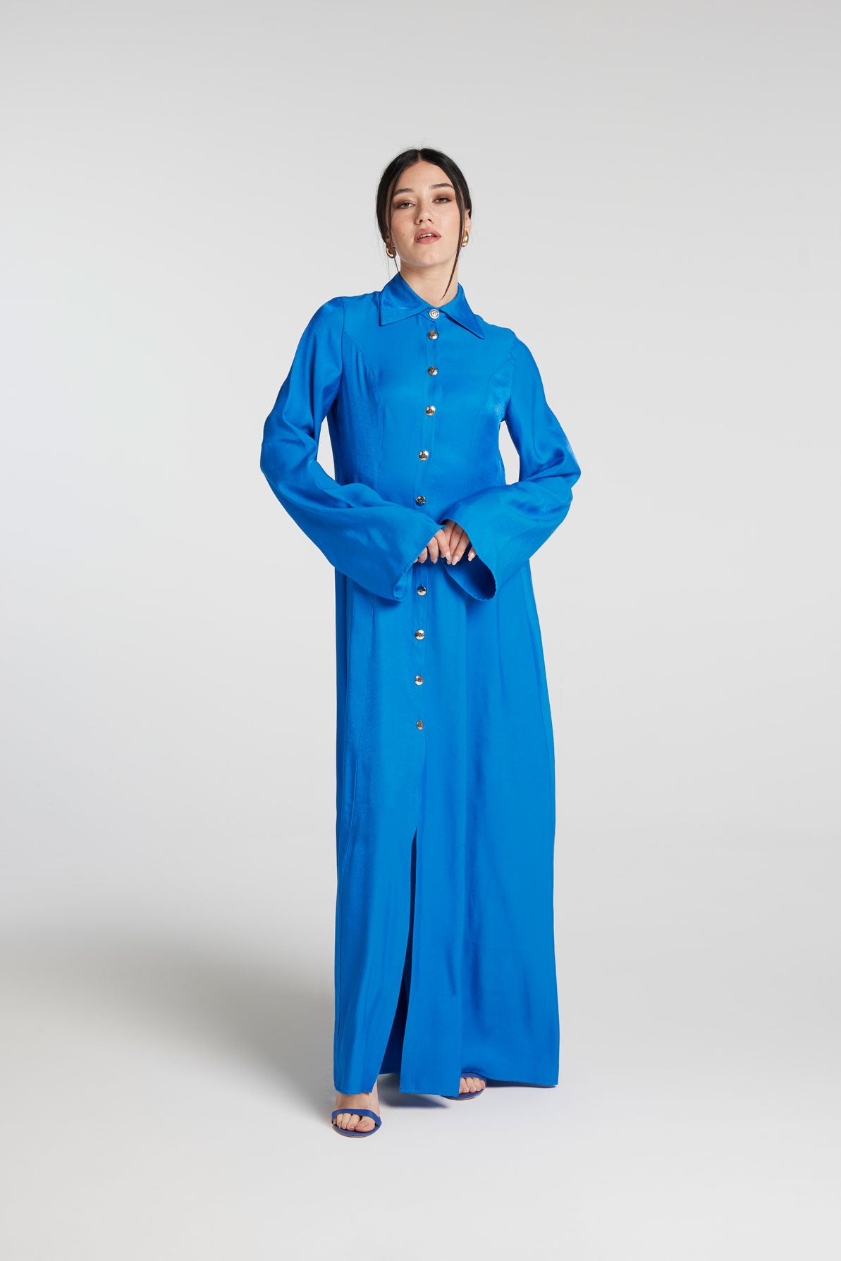 Chemisier molto lungo vestibilità leggermente Over con abbottonatura funzionale con bottoni. Manica a Campana “super lunga”.