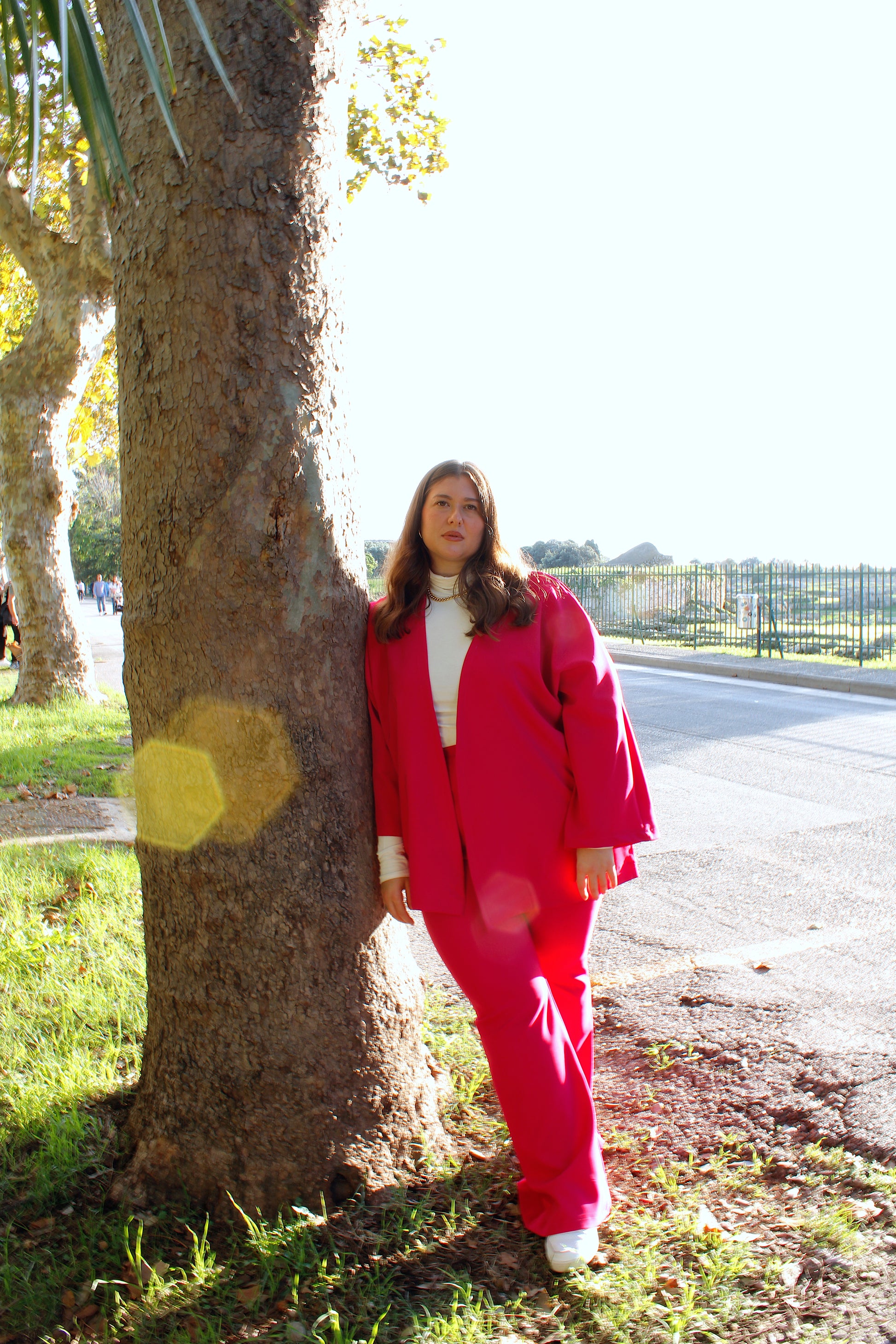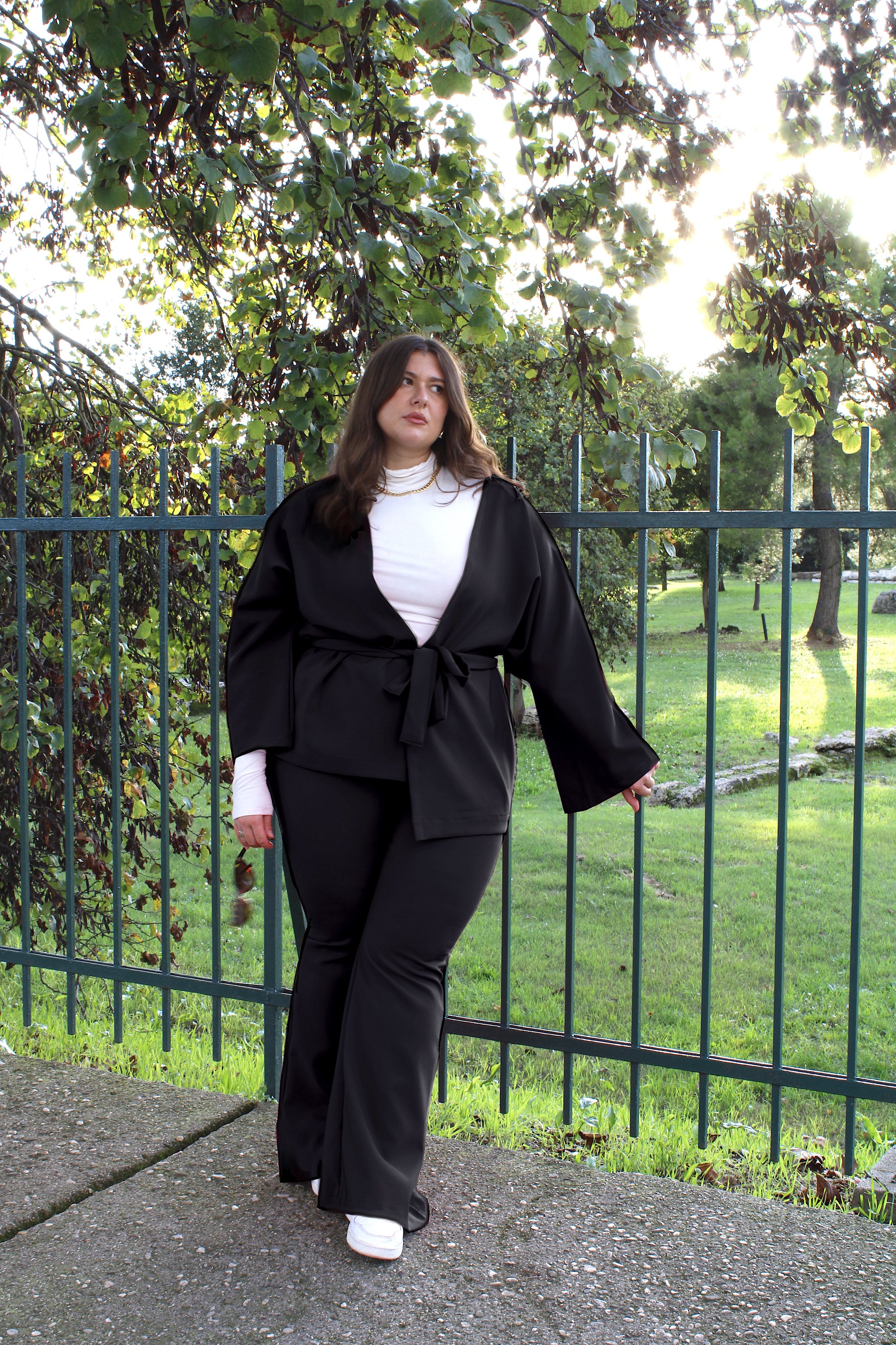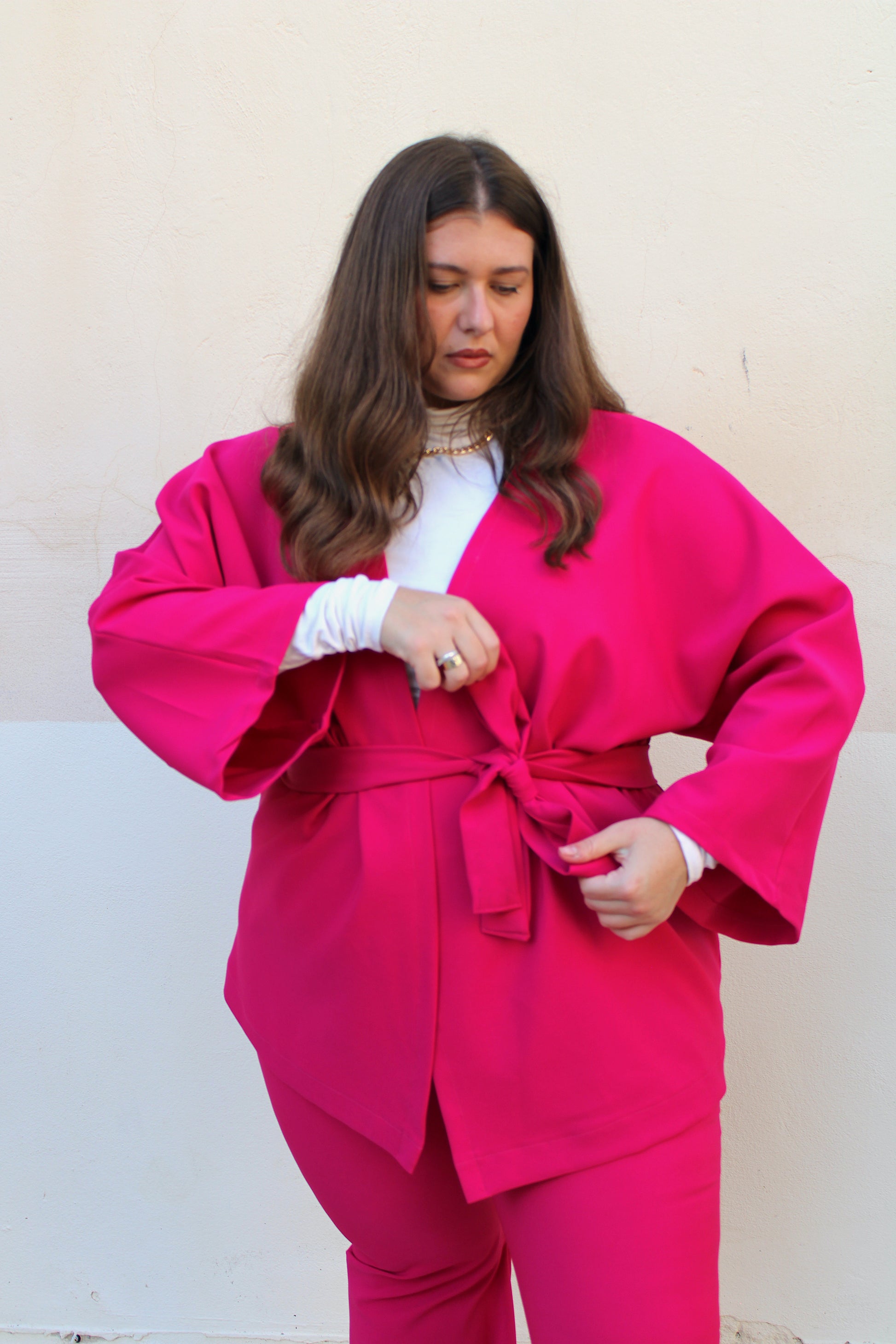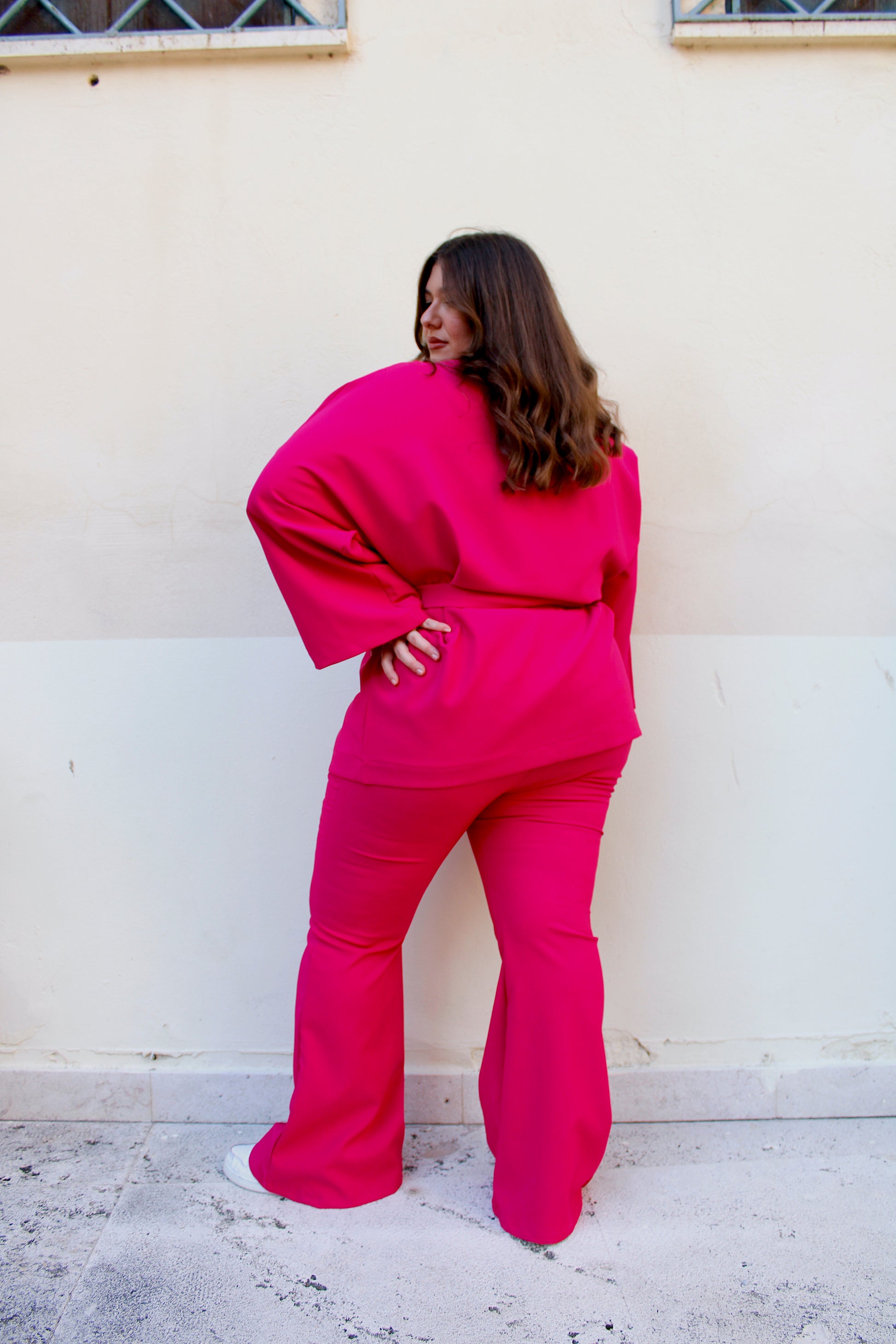 Coordinato composto da Kimono con cintura e pantaloni a vita alta a zampa. Chiusura pantalone con zip invisibile.