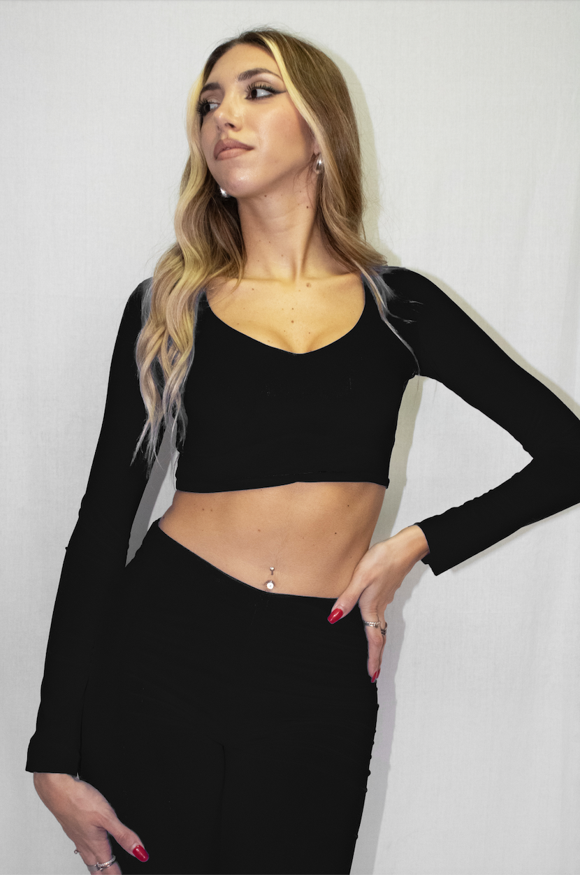 Maglia Crop in Lycra. Tessuto modellante e contenitivo. Mostrina interna nello scollo, nessuna cucitura esterna che stringe e segna. Scollo a V. Manica lunga.