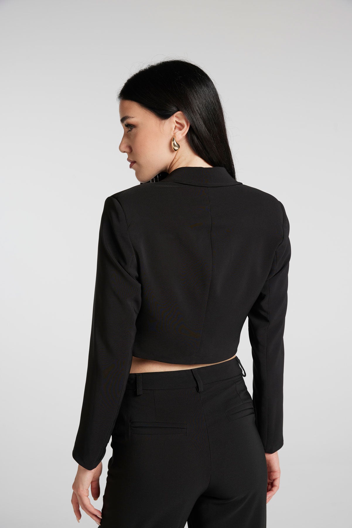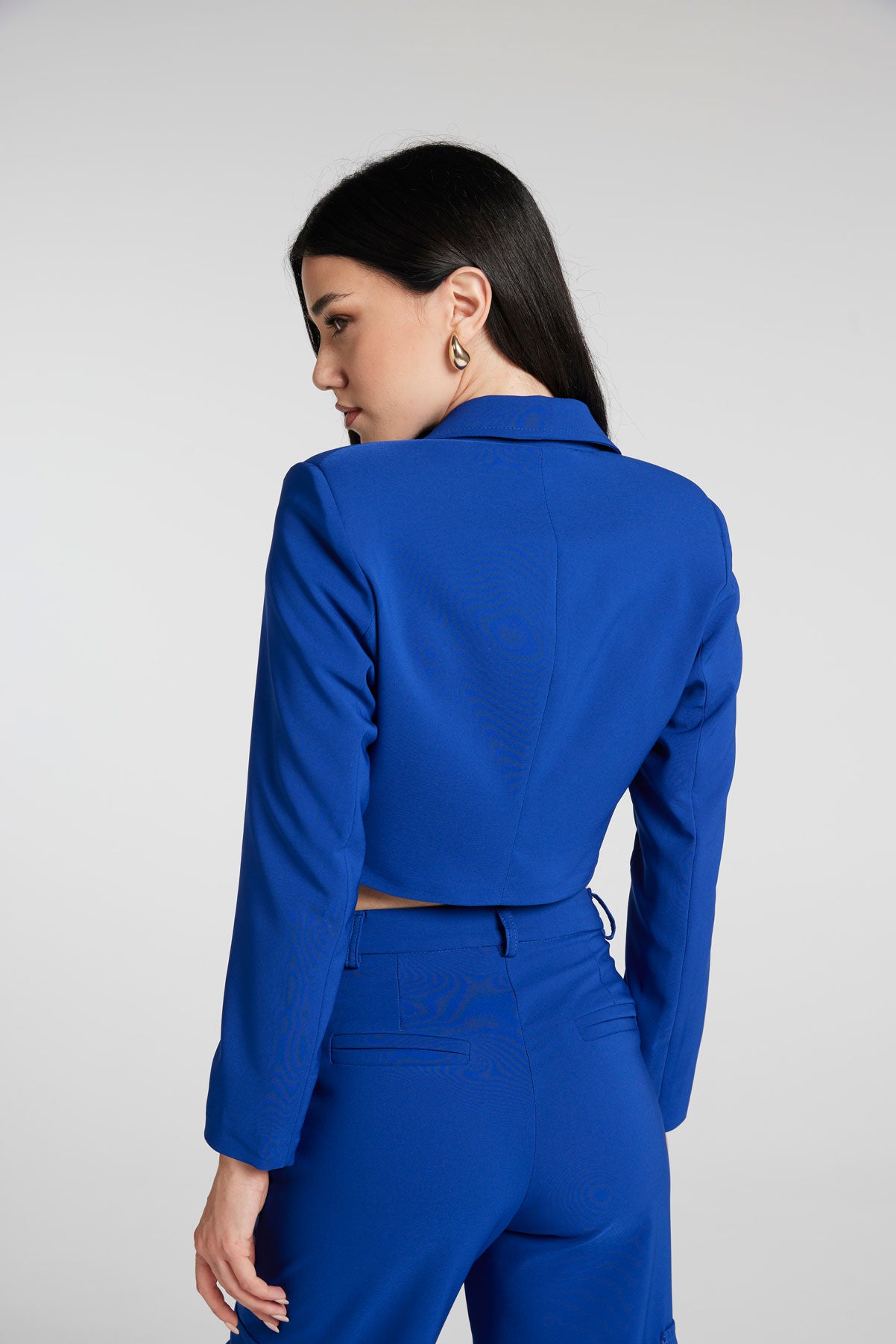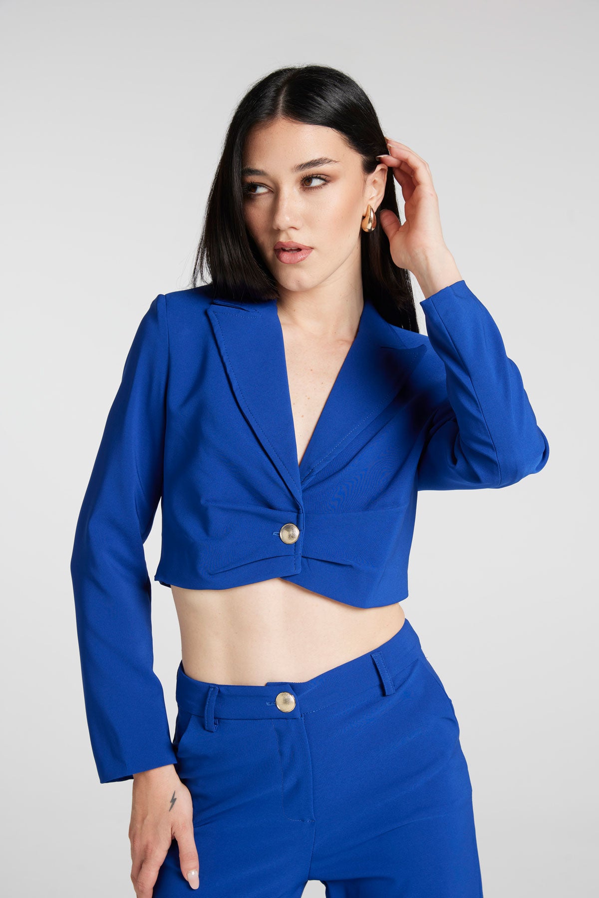 Giacca cropped con pieghe nel davanti e spalline imbottite. (E’ possibile rimuovere le spalline effettuando un piccolo taglio nella fodera). Chiusura centro davanti con bottone. Foderata.