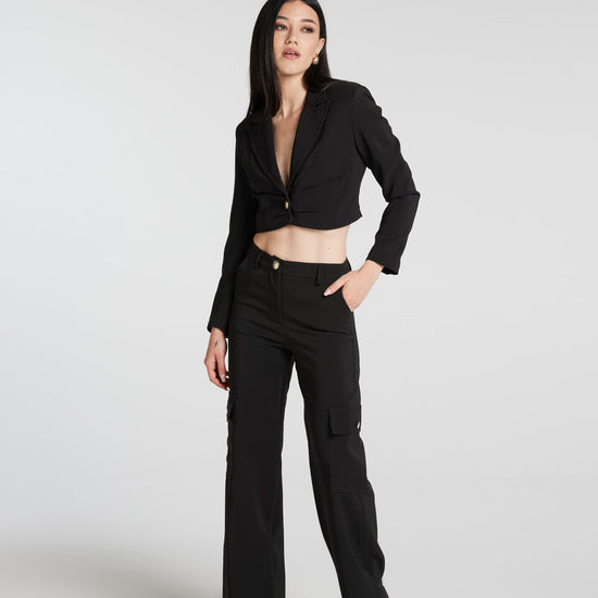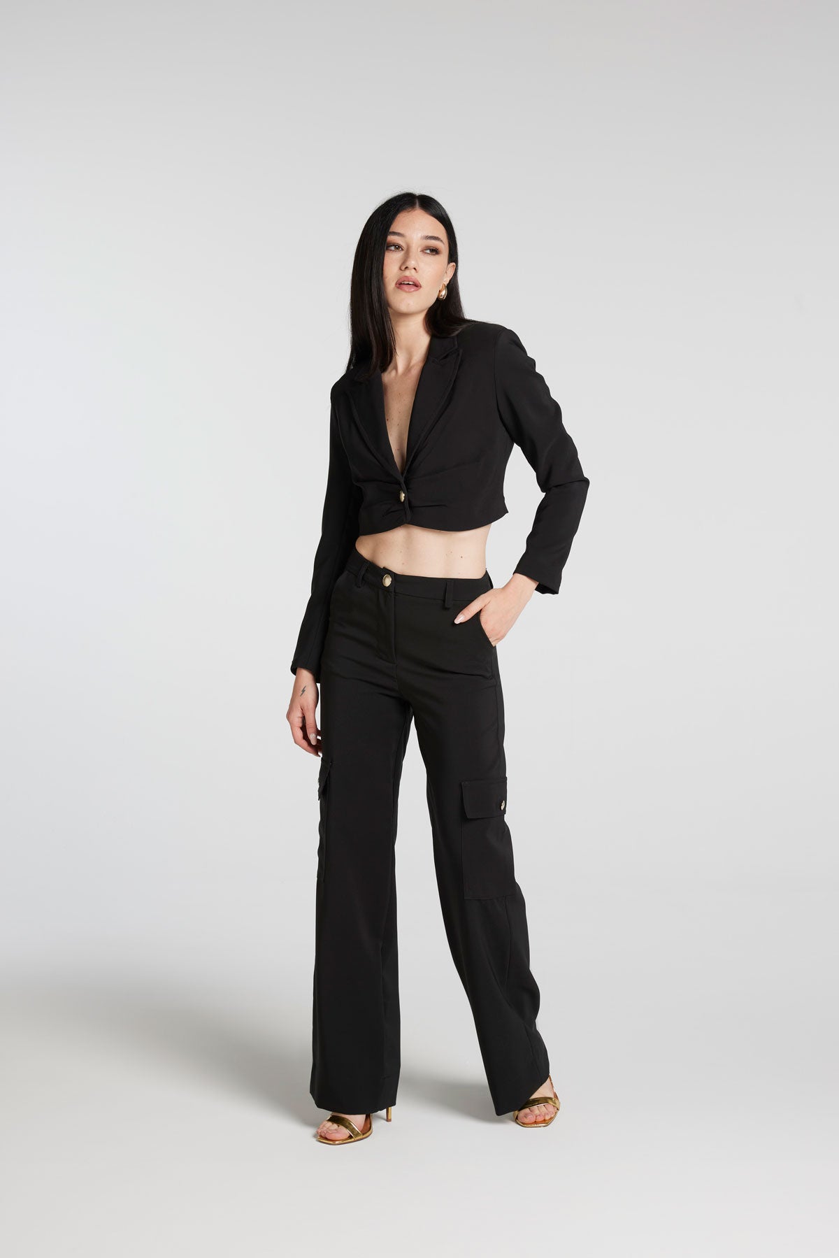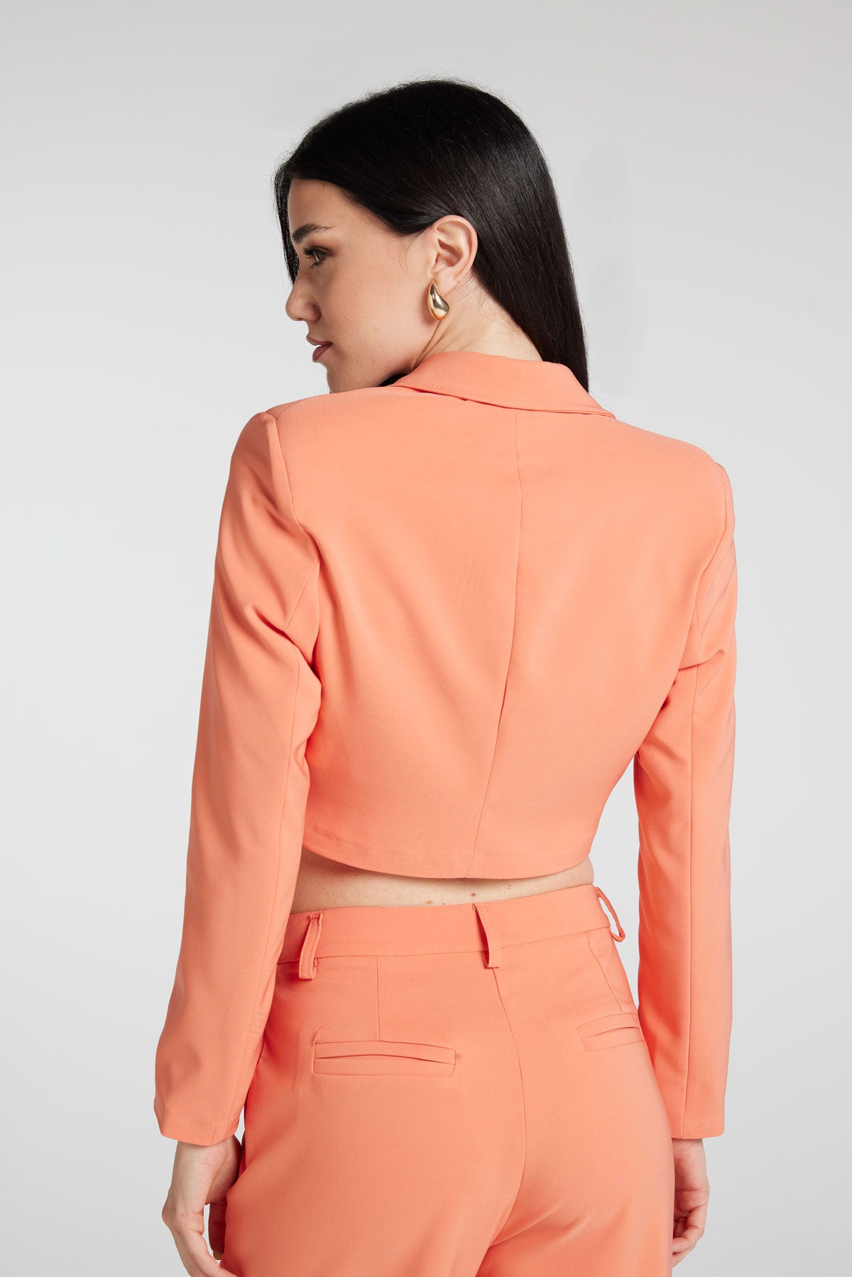 Giacca cropped con pieghe nel davanti e spalline imbottite. (E’ possibile rimuovere le spalline effettuando un piccolo taglio nella fodera). Chiusura centro davanti con bottone. Foderata.