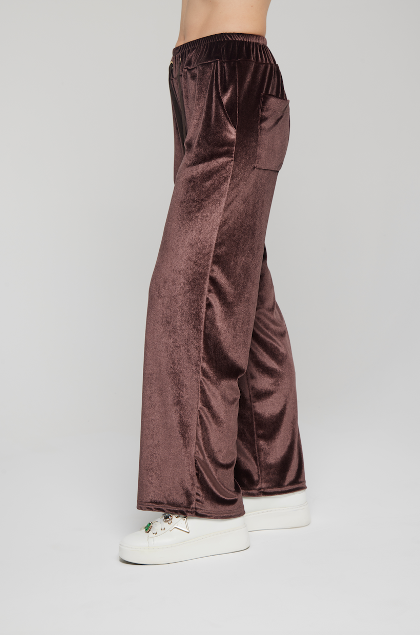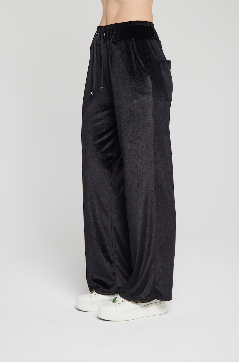 Pantaloni con elastico in vita e coulisse con nastro in gros-grain con campanella cubo. Tasche america. Pantaloni a gamba larga. Tasche quadrate posteriori. Dettaglio occhielli sul davanti del cinturino.