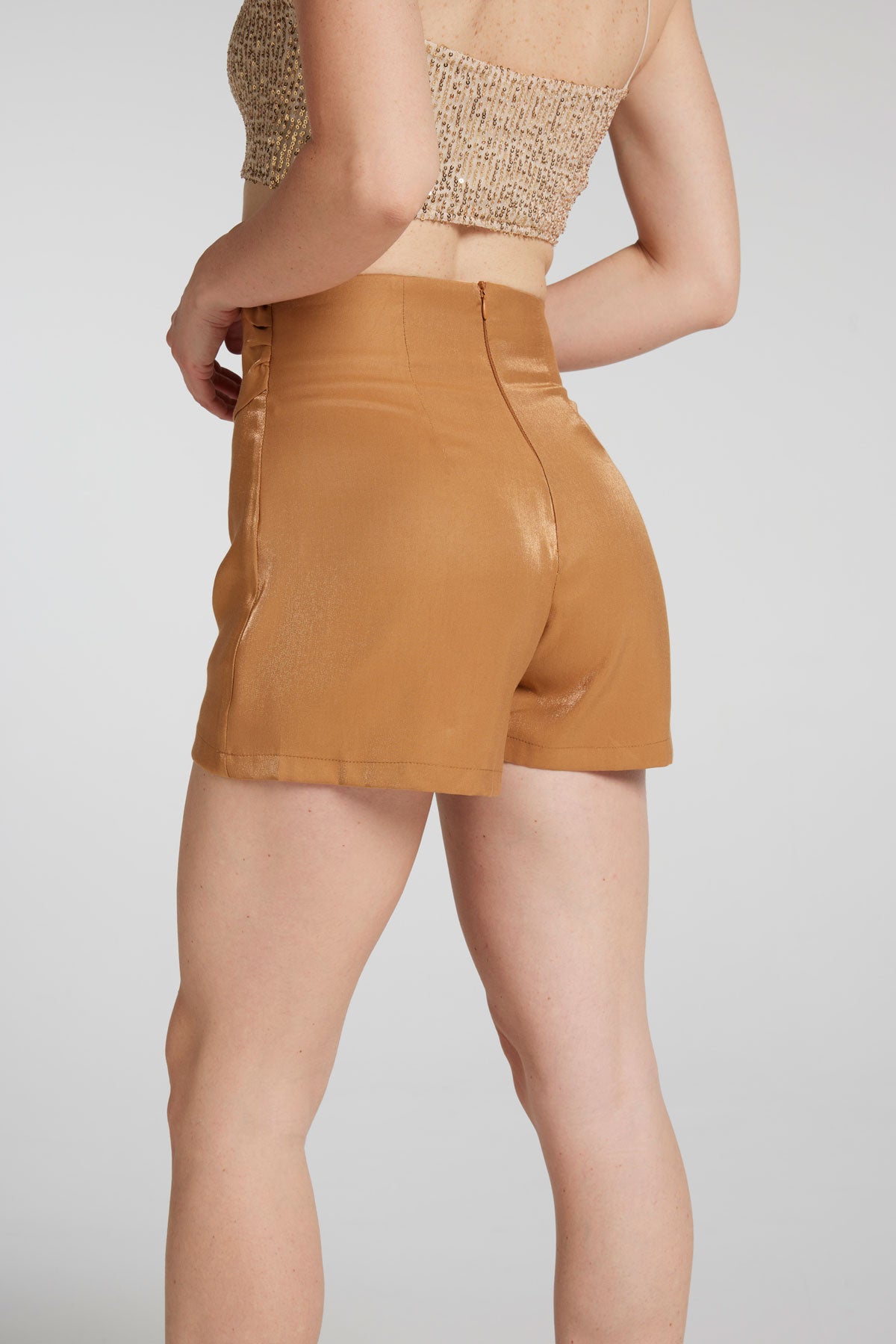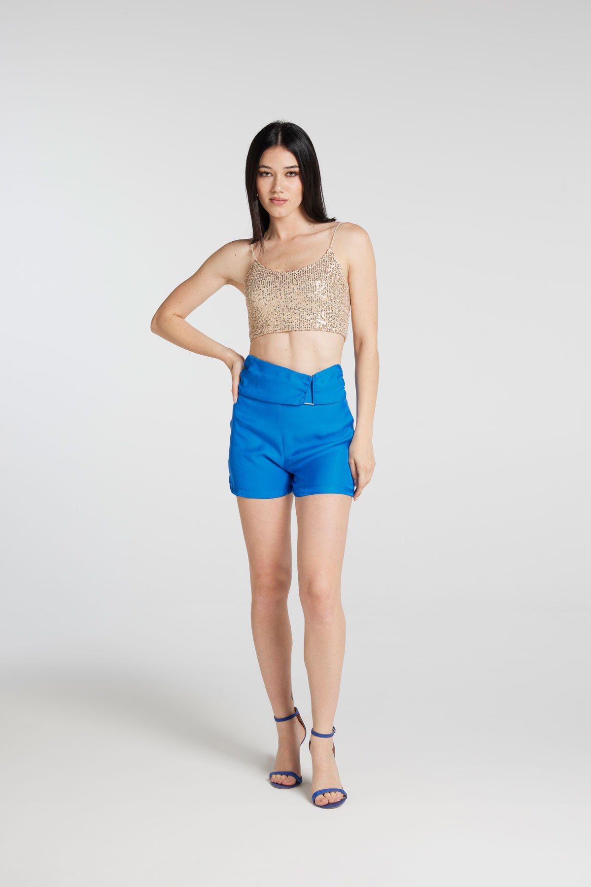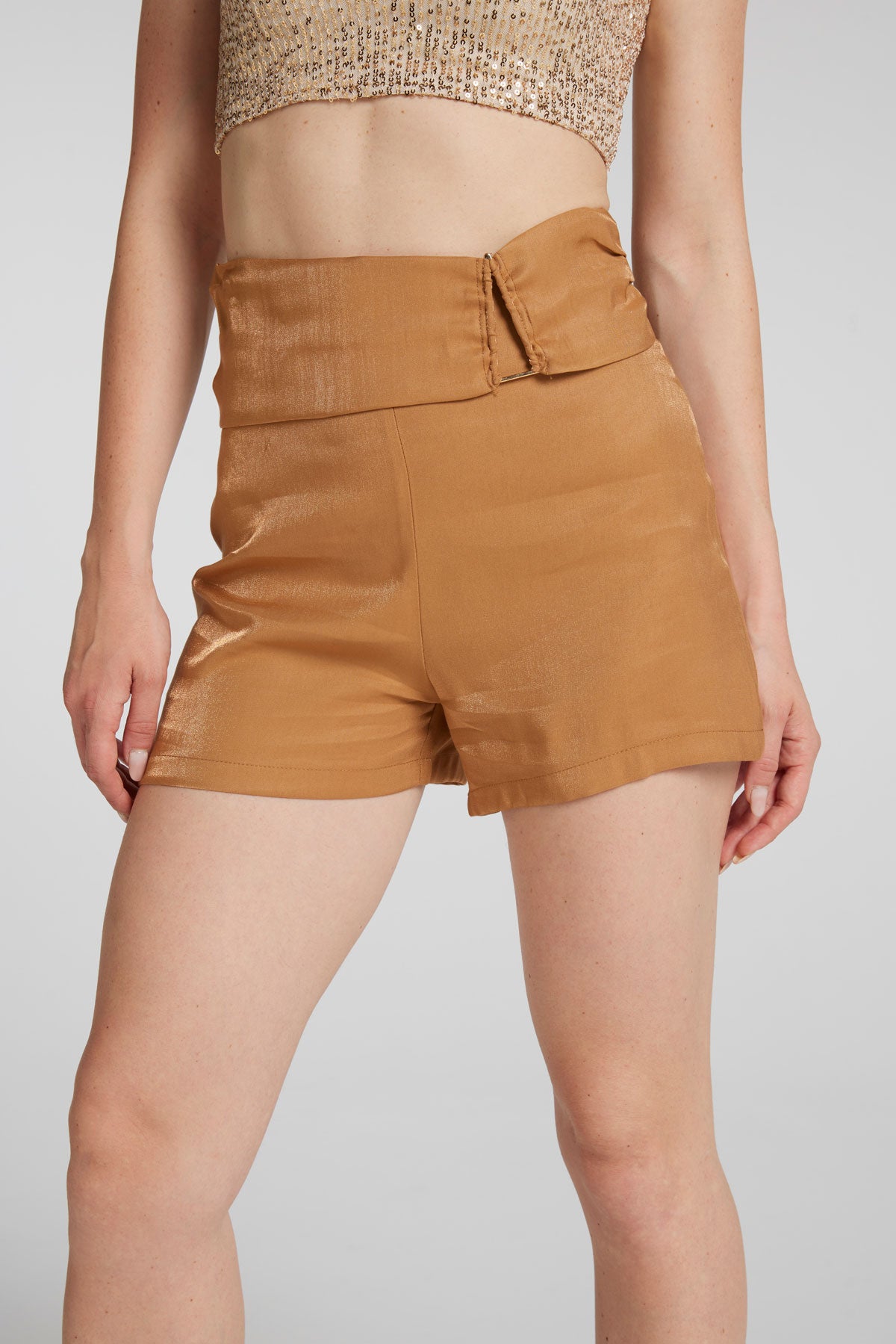 Shorts in Viscosa con fusciacca ed accessorio triangolare gold. Chiusura centro dietro con zip invisibile.