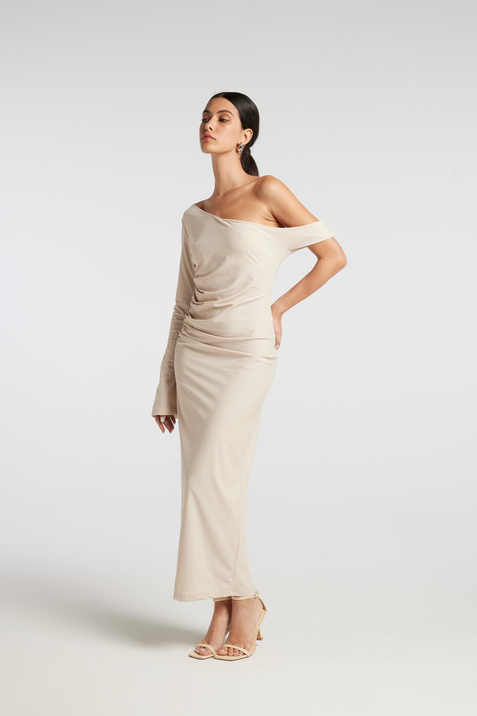 Vestito lungo con scollatura asimmetrica. Spacco posteriore. Manica lunga a campana. Drappeggio nel fianco destro.