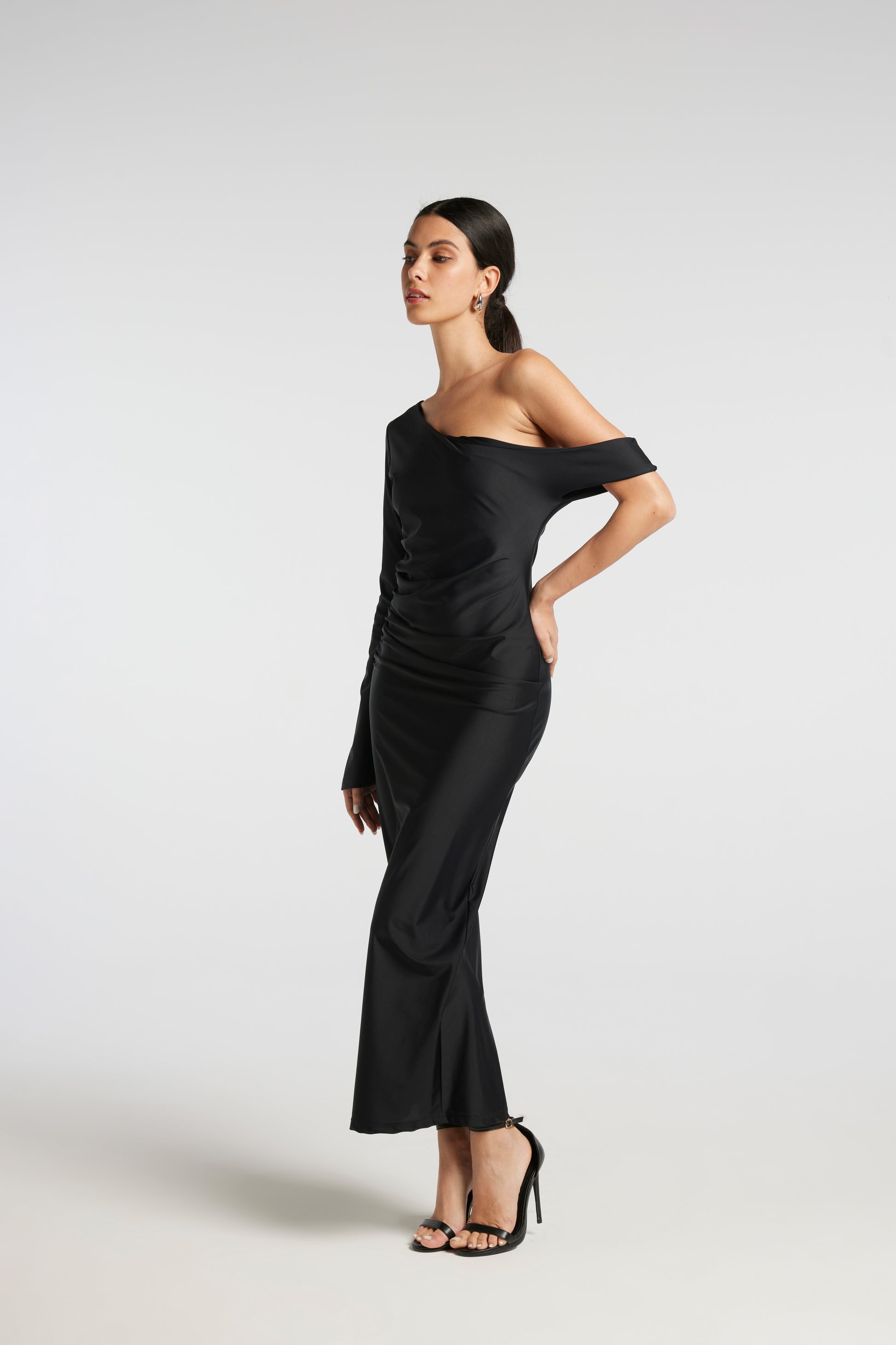 Il drappeggio nel fianco valorizza le forme del tuo corpo donando alla tua silhouette una forma più sottile e slanciata. La scollatura asimmetrica con spalla scoperta ti donerà uno stile unico e raffinato. Abbraccia le forme del tuo corpo, si appoggia perfettamente addosso, ma non stringe e non segna.