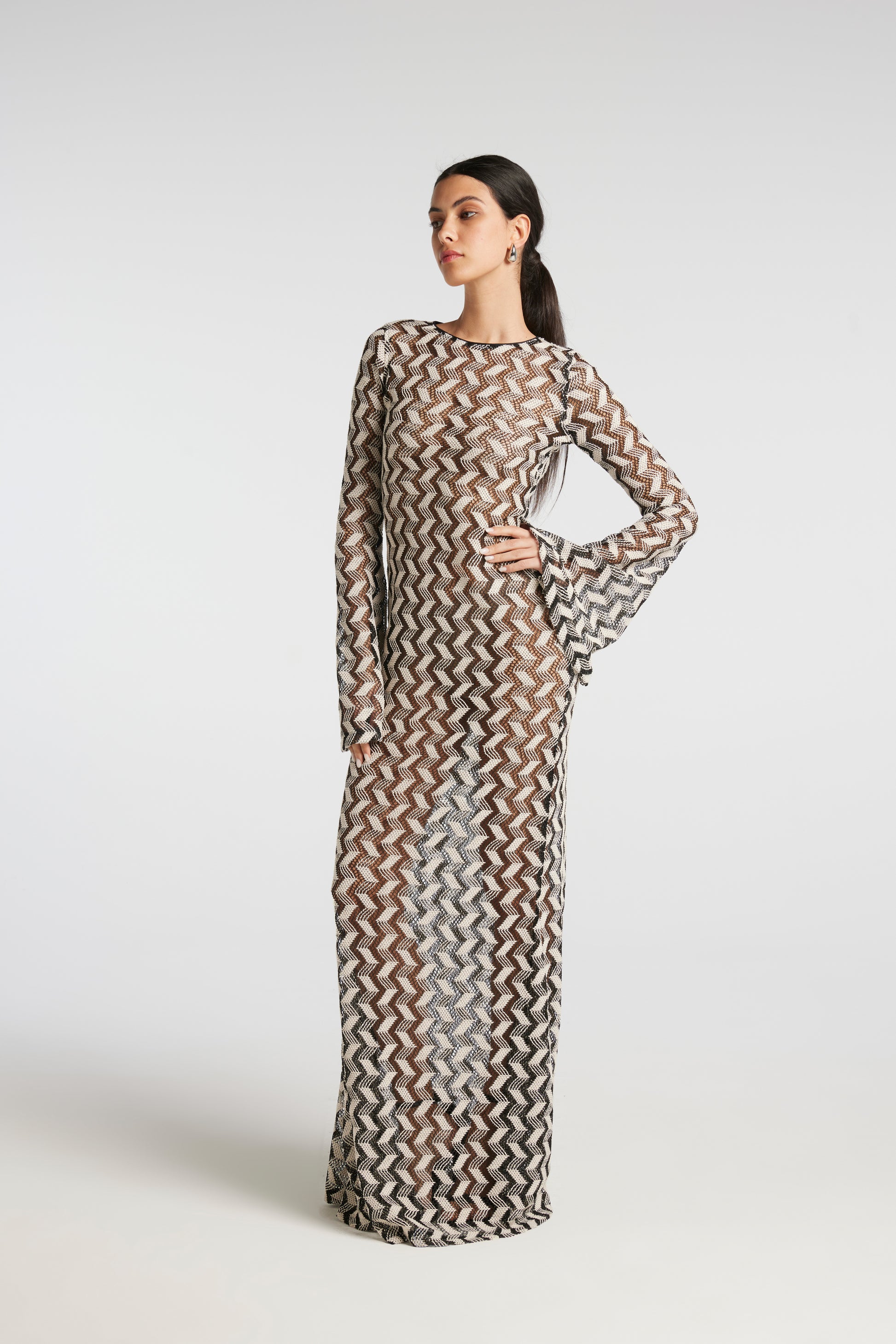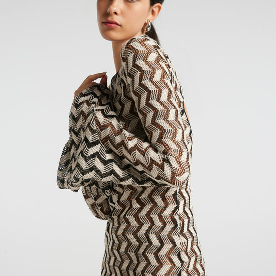Vestito Lungo realizzato in Tessuto Crochet effetto ZEBRA RIVISITATA. Apertura sulla schiena. Chiusura con bottoni a pressione. Manica lunga a campana.